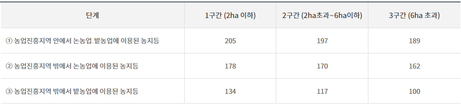 * 「농업농촌공익직불법」에서 「농업진흥지역 내 논‧밭 – 농업진흥지역 밖의 논 – 농업진흥지역 밖의 밭」 3단계로 차등화 - (지급단가) 위의 각 기준면적 구간별로 적용될 지급단가는 구간별로 100만원 이상으로 하되, 지급대상 농지 등의 기준면적이 커질수록 지급단가가 적어지는 방식을 적용