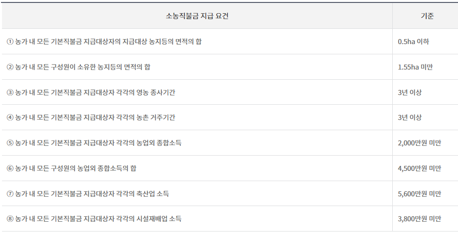 - (지급 요건) 아래 요건을 모두 충족한 농가에게 소농직불금 지급